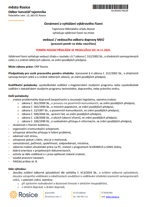 Oznámení o vyhlášení výběrového řízení - vedoucí / vedoucího odboru dopravy MěÚ Rosice.